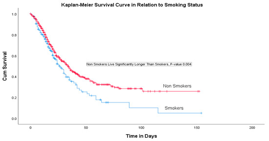 A multivariate logistic regression analysis indicated that the patient’s age, nationality, ethnicity, duration of mechanical ventilation, SOFA score and presence of ischemic heart disease (IHD) were significant predictors for the survival rate (Table 3). COVID-19 patients with coexisting IHD had a 70% higher risk of death compared with others (OR 1.72 (95% CI, 1.10–2.69), p-value 0.02). There were 196 (13.7%) cigarette smokers and the Kaplan–Meier curve revealed a significantly higher survival among non-smokers with COVID-19 with a p-value of 0.004 (Figure 1).