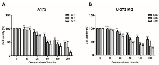 3.1. Luteolin Reduces the Viability of GBM Cells