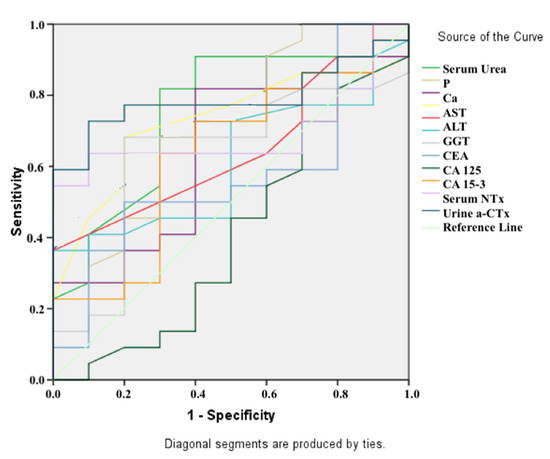 When the group of BC patients considered for this study was segregated into subgroups on the basis of the existence of metastases, the urine α-CTx values (p = 0.001) for both urine α-CTx (μg/mL) and urine α-CTx (μg/mmol Cr) were found to be substantially higher in BC patients suffering from metastases. Urine α-CTx values (sensitivity: 85%; specificity: 70%) were shown to be the sole parameter that differentiated BC patients with metastases from BC patients without metastases in this study. According to the data, the α-CTx levels are greatly affected by changes in bone turnover based on the metastatic encroachment of bone. Bone resorption causes the breakdown of collagen, which results in the leakage of biochemical markers into the circulatory system. Likewise, Leeming et al. [16] expressed that the estimated corresponding increases based on with the existence of one, two, or three metastases are 38%, 57%, and 81%, respectively. Considering the 17% intra-individual variation of the analysis, α-CTx acted as a sensitive biochemical indicator in terms of closely monitoring the cancer patients with the aim of detecting metastasis early. The degradation derivatives of α-CTx facilitate a specifically sensitive index of bone traction [17,18]. Earlier studies have also suggested that CTx markers can be utilized in evaluating skeletal metastases in patients suffering from breast cancer [19,20].