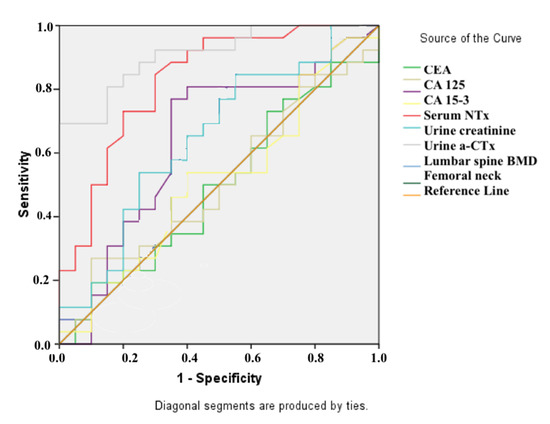 The bones, lungs, liver, soft tissues, and brain are recognized as the most common sites of BC metastases. Considering the fact that there are no chances of cure for BC patients with metastasis, early diagnosis is crucially important. Biochemical markers quickly expose alterations in bone metabolism [7]. In one study, the values of serum NTx and urine α-CTx were found to be at higher levels in BC patients compared to control groups, while urine α-CTx values were recorded at considerably higher levels in BC with metastases. High levels of specificity and sensitivity were observed in the urine α-CTx values (sensitivity: 85%, specificity: 70% for urine α-CTx (mg/mL); sensitivity: 85%, specificity: 70% for urine α-CTx (μg/mmol Cr)) while differentiating BC patients with metastases from the BC patients without metastases. BMD values from the lumbar spine and femur bone were recorded at considerably lower levels in BC patients compared to the control groups, but no difference was observed based on the presence of metastases. These findings suggest that the most usable parameter in detecting the presence of metastases is urine α-CTx.