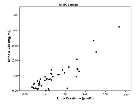 Correlation between α-CTx levels and urine creatinine for all breast cancer patients.