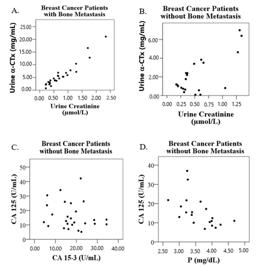 Correlation graphs of the bone metastasis status of patients with breast cancer. A. Correlation between urine α-CTx and urinary creatinine in breast cancer patients with bone metastases; B. Correlation between urine α-CTx and urinary creatinine in breast cancer patients without bone metastases; C. Correlation between CA-125 and CA 15-3 in breast cancer patients without bone metastases; D. Correlation between CA-125 and P in breast cancer patients without bone metastases.