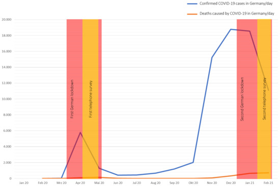 Course of the COVID-19 Pandemic in Germany. (Data are extracted from OurWorldInData.org [5], access date: 28 February 2021).