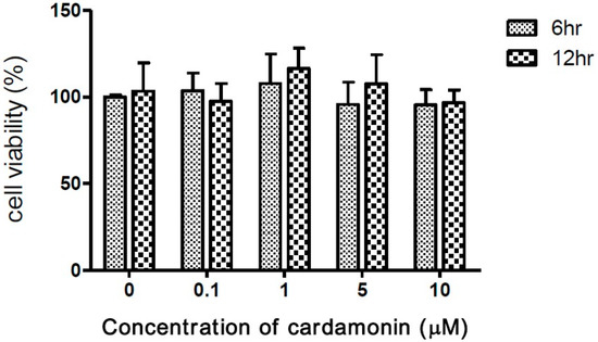 Effects of cardamonin on viability of J774A.1 macrophage cells following incubation with 0–10 μM of cardamonin for 6 or 12 h. Each value represents the mean ± SD of four independent experiments.