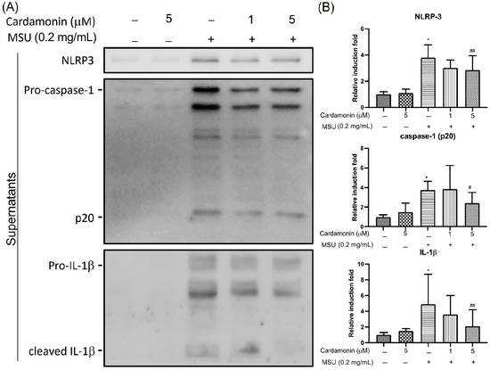 Effects of cardamonin on MSU-stimulated NLRP3 inflammasome activation in J774A.1 macrophage cells treated with MSU for 6 h in the presence or absence of cardamonin: (A) Representative gel showing the effect of cardamonin on MSU-stimulated cells. (B) Western blot analysis used to detect levels of NLRP3, caspase-1, and IL-1β in supernatants. (–) not treatment; (+) treatment. Each value represents the mean ± SD. Statistical differences among the MSU groups were compared against the control values, whereas cardamonin groups were compared against the MSU group using the ANOVA test (n = 5; * p < 0.05 vs. control; # p < 0.05 vs. MSU; ## p < 0.01 vs. MSU).