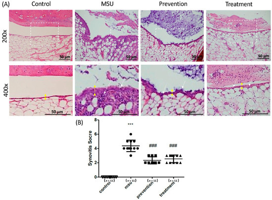 Histopathological analysis of rat knee joints in the four treatment groups, showing the effects of cardamonin on MSU crystals injected into the knee joint cavity: (A) Representative images showing H&E histological staining results (200× and 400×). Yellow double arrow: thickness of the synovial layer; white arrow: infiltration cells. Scale bars: 50 μm. (B) Quantification of synovitis scores in the four groups including MSU, prevention, treatment, and control groups (n = 11 in each group; *** p < 0.001 vs. control; ### p < 0.001 vs. MSU).