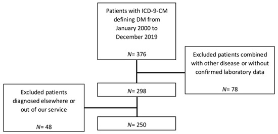 We reviewed the medical charts of pediatric patients aged 18 years or younger with a diagnosis of diabetes mellitus in a medical center that received referrals from a catchment area of nearly 3 million residents in southern Taiwan. Our review retrospectively found a total of 376 cases coded with International Classification of Diseases, Ninth Revision, Clinical Modification (ICD-9-CM) code 250 that defines diabetes mellitus from January 2000 to December 2019. Among them, 78 cases were excluded due to other underlying diseases (such as leukemia) or lacking confirmed laboratory data, and 48 other cases were excluded due to missing pre-treatment or follow-up data because they were diagnosed elsewhere or transferred out of our service after diagnosis. The entire procedure was approved by the Institutional Review Board of the Cheng Kung University Hospital (A-BR-107-033, approved on 24/10/2018). The final analysis included a total of 250 patients (Figure 1).