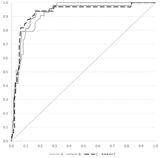 The receiver operating characteristic analysis for the association between non-stimulated levels of C-peptide and insulin use at the time of diabetes mellitus onset (Line A), one year (Line B) and two years (Line C) after diagnosis.