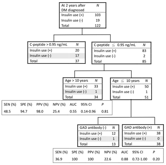 Figure 3 presents the CART analysis in predicting the insulin use at two years after DM diagnosis. The positive predictive value (PPV) for insulin use was 0.98 and the specificity was 0.95 if a patient with an age under 10 had a non-stimulated C-peptide level less than 0.95 ng/mL. Furthermore, the positive predictive value and specificity both reached 1 if a patient with an age under 10 had a non-stimulated C-peptide level less than 0.95 ng/mL and presence of GAD antibodies.
