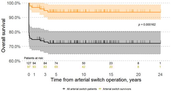 Arterial switch operation is considered a state-of-the-art gold standard for the treatment of various forms of transposition of the great arteries. Surgical mortality of this procedure, when performed in a large high-expertise center, is usually reported in single digits [,,,,,,]. In some centers, the surgical mortality rate is nearly 0% []. As with every surgical procedure, a learning curve must be passed. This is also true with the arterial switch procedure. In their article, Hutter et al. stated that at the beginning of the arterial switch program in their center, mortality rates were as high as 60%, which were gradually reduced to as low as 4%, with an overall mortality rate of 15% in 195 patients operated on between 1977 and 2000 []. Similarly, Khairy et al. also reported an initial mortality rate of 15.1%, which gradually decreased to 3.9% in 400 patients operated on between 1983 and 1999. Other centers have reported similar experiences []. Michalak et al., in their article, reported an overall surgical mortality of 7.4% in a cohort of 715 patients operated on between 1991 and 2015, and a 2.9% surgical mortality rate among the patients operated on between 2001 and 2015 []. There are some centers that have reported extremely low mortality rates throughout []. The majority of publications report data from large centers in which hundreds of arterial switch operations were performed. However, similar surgical mortality rates can be achieved in small and medium case-load centers. Shim et al. reported an astonishing mortality rate of 2.2% among a cohort of 139 patients who underwent an arterial switch operation between 1995 and 2014 in South Korea []. However, other authors from small and medium case-load centers have reported overall surgical mortalities ranging from 4.8 to 28% [,,,]. Similar to the experience of large centers, surgical mortality rates tend to decrease with time [,,,]. Shim et al. reported that two out of three patients who died during the 30 post-operative days were operated on at the beginning of the arterial switch program []. Puras et al. reported a decrease in surgical mortality rates from 19% in patients operated on between 1985 and 1998 to 8% in patients operated on between 1998 and 2010 []. Manso et al. documented a drastic decrease in surgical mortality from 44% to 25% to 16% in patients operated on between 1995 and 2004, 2005–2008, and 2009–2014, respectively []. The gradual improvement of survival may be attributed to the learning curve of the congenital cardiac team. In our experience, the learning curve was extended and required external intervention. There are several major reasons why this occurred. The first attempts to treat patients with the arterial switch operation were made when Lithuania was still under strict Soviet rule. The congenital heart team had limited resources and practically no possibilities to observe and consult surgeons and teams in western countries. Limited economic resources and medical equipment led to a significant number of delayed diagnoses. At the time these patients were referred for surgical treatment, their conditions were severe. After the collapse of the Soviet Union, when Lithuania regained independence, the major issue became the lack of finance of the newly developing health system of a new country. This is reflected in the extremely high surgical mortality rates seen until 1998.