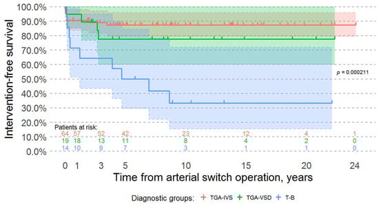 Kaplan-Meier intervention-free survival curves of surviving patients. Time 0 is the day of the arterial switch operation. In our cohort, intervention-free survival is significantly worse among patients with a Taussig-Bing anomaly when compared to patients with transposition of the great arteries and intact ventricular septum and patients with transposition of the great arteries and a ventricular septal defect (Log-rank test p-value = 0.000211). Abbreviations: TGA-IVS, D-transposition of the great arteries with intact ventricular septum; TGA-VSD, D-transposition of the great arteries with ventricular septal defect; T-B, Taussig-Bing anomaly.