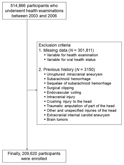 We enrolled study participants aged between 40 and 79 years from the NHIS-National Health Screening Cohort (NHIS-HEALS) from 2003 to 2006, which includes data about not only the weight, height, socioeconomic status of participants, their lifestyle questionnaires, and their laboratory test results, but also their periodontal disease and oral hygiene parameters [10]. A more than one-year washout period was established to rule out participants with unruptured cerebral aneurysms at the beginning of the study. The date of the oral health check-up was defined as the index date for the analysis. When there were serial measurements for each variable, the latest value during the period between 2003 and 2006 was utilized for the analysis. We eliminated participants with missing data. We included 209,620 participants in the analysis using the following criteria (Figure 1).