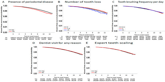 Kaplan–Meier survival curves associated with oral hygiene parameters and the presence of periodontal disease for the risk of cerebral aneurysm development. The Kaplan–Meier curves shows that the risk of cerebral aneurysm development depends on the presence of periodontal disease (A) (p < 0.001) and the number of lost teeth (B) (p = 0.001), but not tooth brushing frequency per day (C) (p = 0.846), dental visits for any reason (D) (p = 0.125), or expert teeth scaling (E) (p = 0.337).