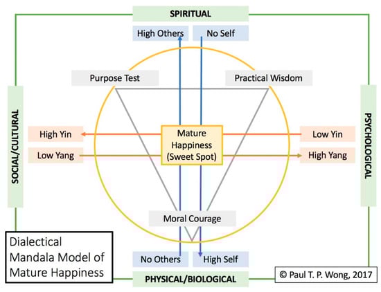Similarly, this model also proposes that sustainable or mature happiness is based on inner peace, equanimity, and harmony, regardless of the circumstances [24], as illustrated by Figure 3. According to Figure 3, mature happiness depends on (1) cultivating inner resources or spiritual virtues, such as courage, wisdom, and meaningful purpose, and (2) the dialectical process of navigating an adaptive balance between self and others and between yin and yang. The resulting mature happiness is also considered noetic happiness because it is based on spiritual virtues.