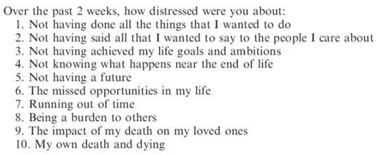 Palliative care patients are wrestling with both the existential problems of suffering and death, and future meaning to fulfill in their remaining days. For example, Figure 4 lists some of the items in Lo et al.’s [47] Death and Dying Distress Scale.
