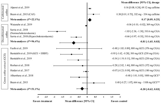 Fourteen interventions reported the effect of coffee (caffeinated coffee (n = 1), decaffeinated coffee (n = 7), and GCE (n = 6)) on HDL-c levels. GCE caused the greatest increase in HDL-c levels, with the percentage of increase ranging from 2.4% to 15.6% (Table 1).