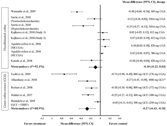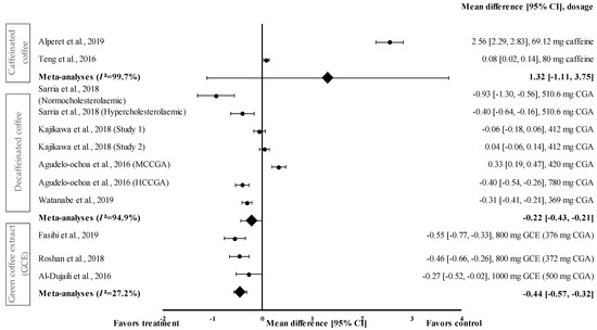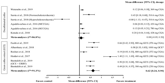 This meta-analysis showed that GCE supplementation effectively improved anthropometric parameters, such as waist circumference. The pooled random effects analysis showed the small reducing effect on waist circumference (d = −0.39, 95% CI: −0.68, 0.10), albeit with a high level of heterogeneity (I2 = 93.0%) (Figure 2). Nevertheless, Fasihi et al. showed that supplementation with GCE containing 376 mg of CGA in capsule form for 8 weeks moderately reduced the waist circumference of participants, with d = −0.65 (95% CI: −0.89, −0.41) [30]. A recent review by Asbaghi et al. showed that, compared to the consumption of high-dose GCE for a short duration, the consumption of low-dose GCE (<400 mg of CGA/day) for 8 weeks effectively reduced body weight, waist circumference, and body mass index [36]. Green coffee beans are rich in CGAs such as 5-caffeoylquinic acid, one of the primary components of CGA that was shown to attenuate diet-induced obesity in mice [35]. The effect is modulated through the suppression of TG accumulation in the liver and the alteration of plasma adipokine levels, which subsequently downregulate adipogenesis-related genes and upregulate fatty acid oxidation-related genes [35,37].
