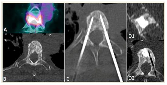 Example of a patient presenting with a unique painful, T4 hypermetabolic colorectal cancer sclerotic metastasis (A,B) treated with bipedicular bipolar radiofrequency ablation (C) and subsequent vertebroplasty in sagittal (D1) and axial (D2) planes.