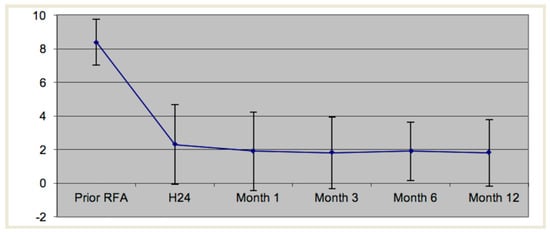 Many therapeutic options are available for patient suffering from spinal metastasis.. Specific medication may lead to well-known side effects, gastrointestinal (NSAIDs, corticosteroids and opioids), neurological (morphine-impaired consciousness, etc.) or intolerance. Chemotherapy has systemic toxic effects and a delayed action. External beam radiotherapy remains the treatment of choice for the palliative treatment of metastatic bone tumors but is not effective in 20–30% cases (10 patients in our series). Furthermore, its analgesic effect is delayed 12–20 weeks []. Surgery is often not appropriate in late-stage cancer patient as it remains very invasive with a long recovery. Percutaneous RFA treatment offers a useful alternative for patients in palliative care units as pain improvement occurs very rapidly after treatment, as shown by several previous studies which have reported the usefulness, safety and rapid pain release after RFA for spinal lesions [,,,]. The choice of bipolar radiofrequency was made on the well-known advantages of bipolar RFA as opposed to monopolar RF-better control of the ablation zone [] and no risk of skin burning due to grounding pads not contraindicated in pacemakers wearers [,]. Moreover, microwave ablation, although it has been reported to be feasible in vertebral lesions [], presents higher risks of complications [].