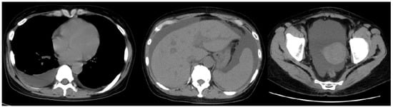 Chest and abdominal computed tomography (CT) images of the patient on transfer to our hospital. CT images show right-sided pleural effusion, ascites, and hepato-splenomegaly.