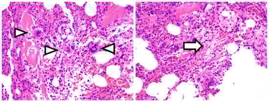 Bone marrow lesions in our patient. Hematoxylin and eosin staining shows a hypercellular marrow with megakaryocyte clusters (arrowheads) and mild reticulin fibrosis (arrow) (×200).