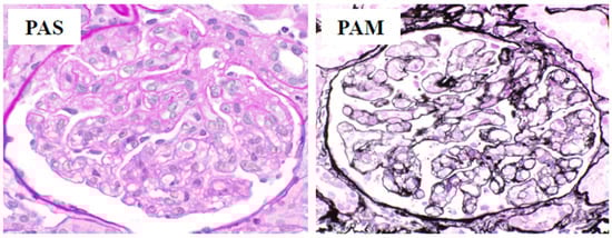 Kidney lesions in our patient. Periodic acid–Schiff and periodic acid methenamine silver staining shows prominent swelling and increased glomerular endothelial cells (×400).