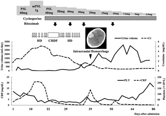 Clinical course of the patient after transfer to our hospital. Cranial computed tomography imaging of the patient shows a life-threating hemorrhage in the right subarachnoid space and cerebral hemisphere. CHDF, continuous hemodiafiltration; Cr, creatinine; CRP, C-reactive protein; HD, hemodialysis; PLT, platelets; PSL, prednisolone.