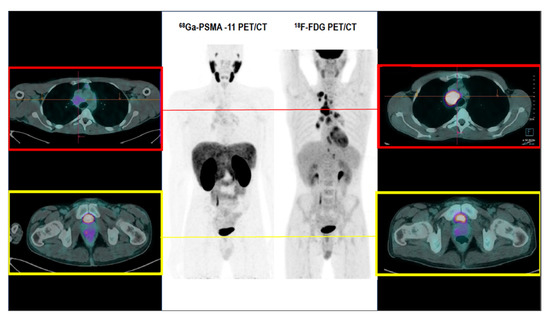 A 38-year-old man was referred to our Institution in May 2020 for the diagnostic workup for weight loss, asthenia, and Prostate-Specific Antigen (PSA) elevation (10.49 ng/mL). A right lobe prostatic adenocarcinoma (Gleason score 3 + 3) was diagnosed after pelvic Magnetic Resonance Imaging (MRI) and fusion biopsy. Given the favorable risk, the active surveillance strategy was started [1,2]. However, given the subsequent raising of PSA (13.45 ng/mL), and the appearance of an enlarged right supraclavicular lymphadenopathy, the patient underwent a 68Ga-Prostate Specific Membrane Antigen-11 Positron Emission Tomography/Computed Tomography (68Ga-PSMA-11 PET/CT) for staging purposes. The 68Ga-PSMA-11 PET/CT scan documented a moderate focal 68Ga-PSMA-11 uptake in the right lobe of the prostate (Maximum Standardized Uptake Value, SUVmax 7.2, Figure 1), coherent with known primary prostate cancer. However, enlarged low-PSMA expressing mediastinal lymphadenopathies were also observed (SUVmax 5.1, Figure 1). The coexistence of moderate PSMA expressing primary prostate carcinoma and low PSMA expressing enlarged lymphadenopathies might be misinterpreted as due to the same underlying histopathology. However, given the favourable risk profile of prostate carcinoma and the atypical site of nodal disease, the suspicion of another malignancy independently involving mediastinal lymph nodes was raised. A subsequent 18F-Fluorodeoxyglucose (18F-FDG) PET/CT was thus performed, in order to guide the histopathological sampling and for staging purposes. 18F-FDG PET/CT showed high tracer uptake by multiple mediastinal lymphadenopathies (SUVmax 15.3 at the station 4R, Figure 1), paralleled by the low right lobe prostate cancer 18F-FDG-avidity (SUVmax 3.5, Figure 1). According to 18F-FDG PET/CT findings, ultrasound-guided transbronchial needle aspiration was performed, showing the presence of a concomitant Hodgkin lymphoma, scleronodular variant. Bleomycin-Dacarbazine-Doxorubicin-Vinblastine (ABVD) chemotherapy scheme was thus administered to the patient obtaining complete metabolic response (CMR—Lugano Classification) at interim as well as at the end-of-therapy 18F-FDG PET/CT [3]. Prostate cancer active surveillance is currently ongoing.