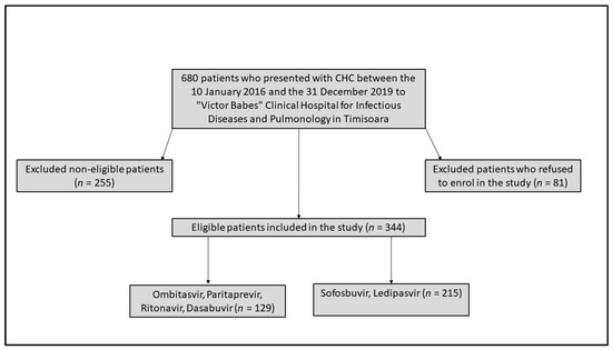 This research follows an observational study design, detailing our prospective cohort, evaluating data collected by the First Department of Infectious Diseases at the Dr. Victor Babes Clinical Hospital for Infectious Diseases and Pulmonology in Timisoara, Romania. The study comprised patients diagnosed with CHC who had received interferon-free therapy from 1 January 2015 to 31 December 2018. Hepatitis C was diagnosed according to currently available guidelines [