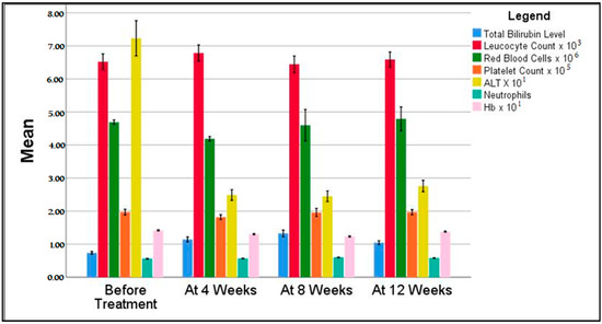 p value < 0.0000). In the same manner, post hoc analysis returned significant changes every four weeks, predominantly in hemoglobin level, neutrophils, ALA, and total bilirubin level. However, the findings did not change to pathological values compared to our laboratory’s normal range. None of the tested blood parameters worsened outside physiological levels throughout the 12-week regimen, even though there were statistically significant changes at every four weeks, and between the start and finish of the DAA regimen. There was also no significant difference in liver fibrosis stages between the two study groups, although there was an alarming percentage of liver cirrhosis cases (18.6% vs. 19.0%).
