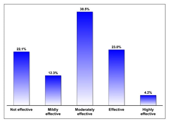 The use of intra-articular HA injections in the management of knee OA is prevalent in orthopedic practice []. This was confirmed among the surveyed sample of orthopedic surgeons in this study in which more than two-thirds of them reported using HA to relieve pain and improve physical function among their knee OA patients. However, the reported HA efficacy in managing pain and improving physical function was variable since less than one-third of the respondents reported that the intra-articular HA injections were effective or highly effective. This is in line with the controversial and conflicting results in the literature [,,,]. Although multiple studies have shown that HA results in significant improvement in physical function and pain management, these results were not confirmed in other systematic reviews and meta-analyses of randomized controlled trials [,]. Nonetheless, about two-thirds of respondents (65.7%) reported that the intra-articular HA injections were moderately effective to highly effective in managing knee OA, and only 22.1% reported that they were not effective. This suggests that the intra-articular HA injections can be useful and should be considered in the management of OA, which is consistent with some clinical guidelines for the management of OA. Additionally, the published patient-reported outcomes on the use of intra-articular HA injections for the management of knee OA are positive [,,].