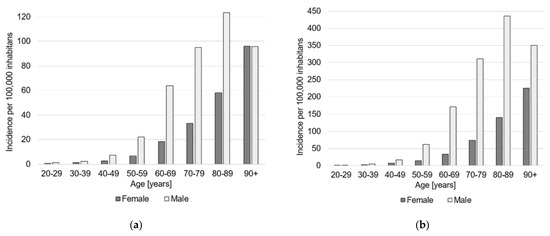 Age and sex adjusted incidence rates per 100,000 inhabitants for the year 2019. (a) Major amputations, (b) minor amputations. Female cases are shown in dark grey and male cases in light grey.