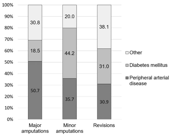 Main diagnoses of patients undergoing major amputations, minor amputations, and revision surgeries of an amputation site in 2019.