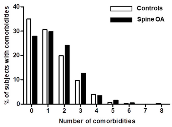 Figure 1. Distribution of proportion of controls and subjects with spine OA according to the number of comorbidities. Abbreviation: OA, osteoarthritis.