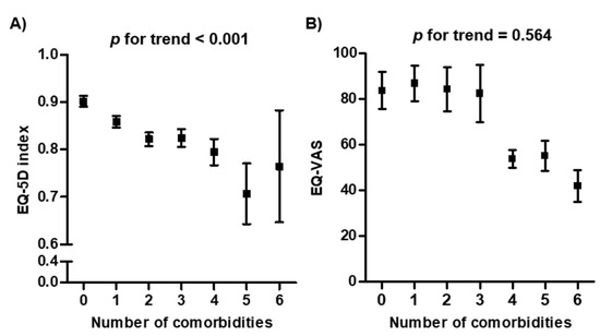 Figure 2. Distribution of health-related quality of life according to the number of comorbidities in subjects with spine OA (A) EQ-5D index according to comorbidities. (B) EQ-VAS according to comorbidities. Abbreviation: EQ-VAS score, EuroQOL visual analogue scale scores; EQ-5D index, EuroQOL-5dimension index.