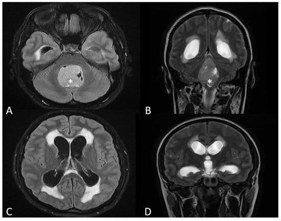 On physical examination, we noticed left congenital optic atrophy, a slight impairment of the left-hand coordination, and horizontal nystagmus. Optic fundoscopy showed right eye papillary edema. Breastfeeding was stopped. A gadolinium-enhanced MRI (magnetic resonance imaging) scan revealed a 33.5/33.3/48.7 mm intraventricular tumor, located in the 4th ventricle, compressing the brainstem and the cerebellum (Figure 1A,B), with cerebellar tonsillar herniation through the foramen magnum. The lesion showed inhomogeneous gadolinium enhancement. Secondary triventricular obstructive hydrocephalus was also noted (Figure 1C,D). The imagistic aspect was suggestive of MB.
