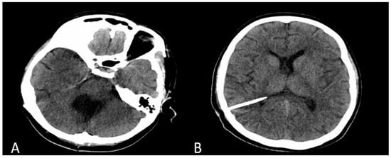 Tissue pieces were sent for histopathological examination, which confirmed the initial diagnosis, further classifying the tumor as a classic variant of MB as per the revised WHO classification of tumors of the central nervous system (CNS) published in 2021 []. An initial control computed tomography (CT) scan showed complete resection of the 4th ventricular tumor, with no signs of postoperative hemorrhage, and reduced dimensions of the lateral and 3rd ventricles. Despite the normal early postoperative imagistic aspect (Figure 2A), the patient required a ventriculo-peritoneal shunt at 15 days after surgery. A second postoperative CT scan showed a decrease in size of the lateral and 3rd ventricles (Figure 2B) and the patient recovered well with slow remission of the neurological symptoms. She was referred to oncology, for adjuvant chemotherapy (Packer protocol—vincristine, cisplatin, lomustine) and radiotherapy (53.2 Gy in fractions of 1.6 Gy daily, five times weekly and a local dose up to 54–55.8 Gy to the posterior fossa) []. At 6 months follow-up, the patient was in a good condition, with only mild ataxia and dysarthria, but still under the care of the oncological and neurosurgical team.