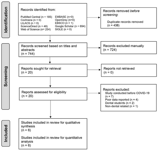 During the initial search, a total of 1182 articles were retrieved (Figure 1). A total of 438 articles were eliminated after duplication was removed, followed by 724 articles being discarded after screening based on titles and abstracts; the remaining 20 articles were chosen for full-text evaluation. Finally, only six studies were included in the current review encompassing a total of 6904 dental practitioners. The average inter-investigators’ Kappa score was 0.82 during the study selection process, which indicates a ‘perfect’ agreement [14]. Figure 1 depicts the reasons for article exclusion.