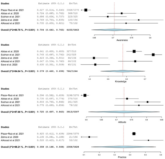 Sensitivity analyses were carried out by removing each data set one at a time. The highest and lowest weight mean awareness levels were 72.3% (CI: 69.1, 75.5) and 68.8% (CI: 62.7, 74.9), when Plaza-Ruiz et al. [3] and Zahra et al. [15] were omitted, respectively. Furthermore, the highest and lowest weight mean knowledge levels were 61.8% (CI: 50.3, 73.4) and 53.6% (CI: 41.0, 66.3), when Zahra et al. [15] and Subhan et al. [4] were removed, respectively. The highest and lowest weight mean attitude levels were 76.9% (CI: 72.2, 81.7) and 69.8% (CI: 57.9, 81.7), when Plaza-Ruiz et al. [3] and Subhan et al. [4] were eliminated, respectively. Finally, the highest and lowest weight mean practice levels were 46.0% (CI: 37.1, 54.9) and 32.5% (CI: 19.2, 70.2), when Zahra et al. [15] and Plaza-Ruiz et al. [3] were omitted, respectively.