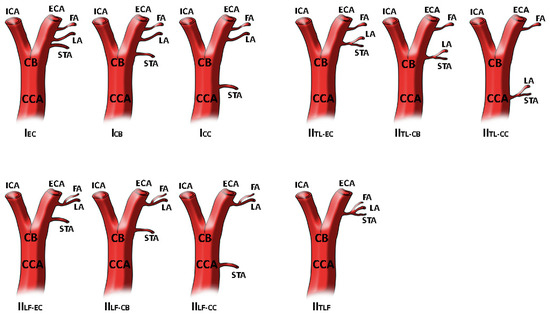 In addition, the analysis conducted in 2011 by Natsis and colleagues [7], described the origin of the STA as part of a common trunk with the LA with no case found for the thyrolinguofacial trunk. However, Natsis and colleagues proposed a new classification system with two main branching patterns, as reported in Figure 1.