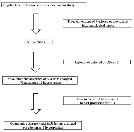 It may be challenging to differentiate adenoma (PA) from hyperplasia (PH) and other neck structures, such as lymph nodes and thyroid nodules, because of visual similarities of these structures on the conventional US [21,22]. Both parathyroid lesions, adenoma, and hyperplasia, appeared 100% hypoechoic in our study. As described in other studies, the fat tissue component reduction in these lesions is responsible for the aforementioned appearance, in the US [3,8]. Part of lesions presented with cystic inclusions, more commonly in PH (14.3% in PA vs. 58.2% in PH, p = 0.001). There was a similar tendency for hyperechoic central parts in both lesion types, although with no statistically significant difference in this study. Cakir et al. have also reported the majority of parathyroid lesions being hypoechoic (92.1% of typical PA, 100% of PH); with cystic inclusions more frequent in PH 17.6% vs. PA 13.9%, respectively [23]. Parathyroid gland cysts are reported to develop possibly due to local degeneration of the gland, following retention of colloid secretion or after haemorrhage [24]. Cysts may be seen in both malignant and benign parathyroid lesions [25,26,27]. Hyperplasias were generally smaller volume than adenomas in our study (p = 0.039); however, PH may present with the same size as PA, due to long-term dialysis in patients with secondary hyperparathyroidism (HPT) [28].
