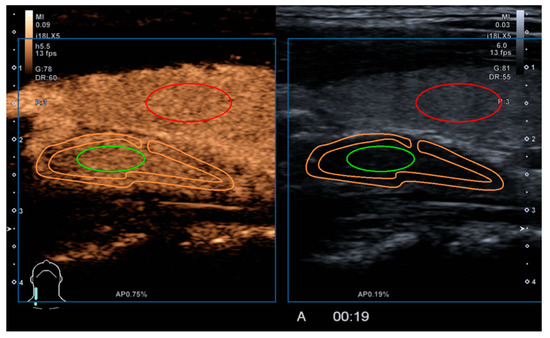 Post-processing of acquired CEUS examination. Marking the regions of interest in the parathyroid centre (green), parathyroid periphery (orange), thyroid gland (red).