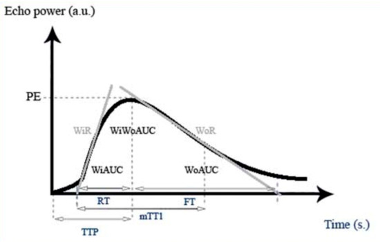 Signal intensity (echo power) in arbitrary units (a.u.), as a function of time in seconds (s), in a parathyroid lesion. Contrast enhancement increases until reaching Peak-Enhancement (PE). Wash-in area under the curve (WIAUC), Wash-in Perfusion Index (WiPI), Wash-in Rate (WiR), Wash-out area under the curve (WoAUC), Wash-in and Wash-out area under the curve (WiWoAUC), Wash-out Rate (WoR), Time to Peak (TTP), rise time (RT), mean transit time (local) (mTTl) and fall time (FT), permission to use the image is provided [20].