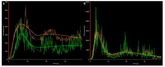 Time intensity curve of average contrast signal intensity in the parathyroid lesions, green—central part of the lesion, orange—periphery. (A) PA—higher ACSI values observed in periphery; (B) PH—contrast dynamics are similar in lesion centre and the periphery, with higher ACSI values than in PA. The ascending and descending parts of the curve were linear. A second small peak of enhancement, due to reperfusion was observed.