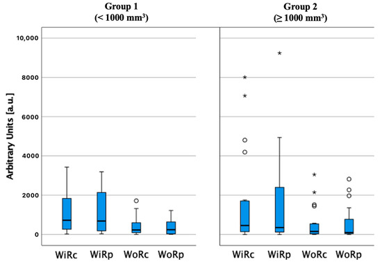 Wash-in and wash-out rate comparison in the parathyroid lesion centre (WiRc and WoRc, respectively) and periphery (WiRp and WoRp, respectively) in different parathyroid adenoma volume groups, ○ and *—number of cases (not shown).
