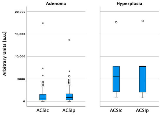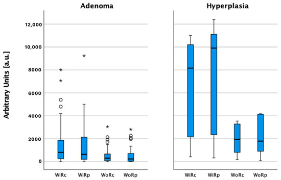 Statistical evaluation was performed using IBM SPSS 28.0 (IBM Corp., Armonk, NY, USA). Categorical variable comparisons were performed using the chi-square or Pearson exact test, and continuous variables were evaluated with the Student t-test or Mann–Whitney U-test, as appropriate. A p-value < 0.05 was used to define significant results. Analysis of variance (ANOVA) was used to compare means of all parameters within groups: adenoma or hyperplasia.