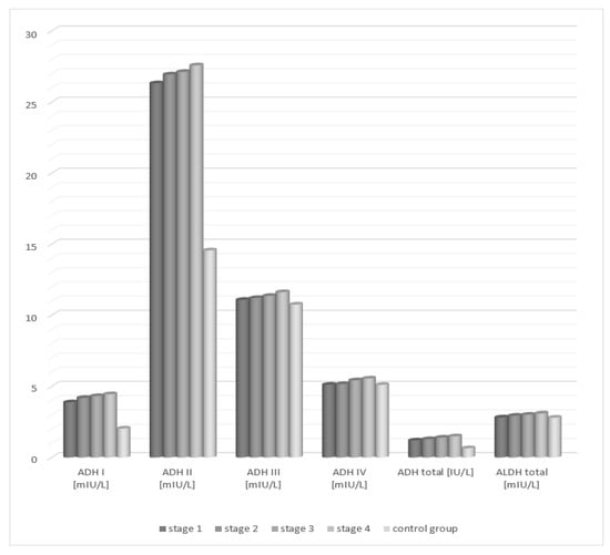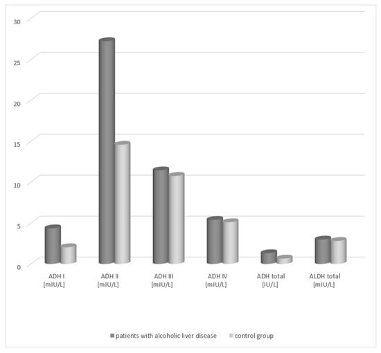 The presence of mainly total ADH and class I, II, and III ADH isoenzymes as well as ALDH was demonstrated in hepatocytes. Many studies have demonstrated significant changes in the activity of alcohol dehydrogenase (ADH), its isoenzymes, and aldehyde dehydrogenase (ALDH) in the blood serum of patients with different liver diseases, which provides grounds for considering these enzymes as hepatocellular damage indicators [3]. An increase in the activity of ADH and its isoenzymes was demonstrated in the course of, for example, C and B viral hepatitis, liver cirrhosis, liver cancer, and autoimmune hepatitis [5,6,7]. Some authors observed an increase in the activity of total ADH and its isoenzymes (mainly ADH I and ADH II) in the serum of patients suffering from a non-alcoholic fatty liver [8]. Moreover, it is believed that the level of enzyme serum activity is determined by the degree of hepatocellular damage due to the toxic effects of ethyl alcohol [6]. The current study assessed the changes in the activity of alcohol dehydrogenase, the activity of its isoenzymes, and aldehyde dehydrogenase and their diagnostic utility in the serum of patients with alcoholic liver disease.