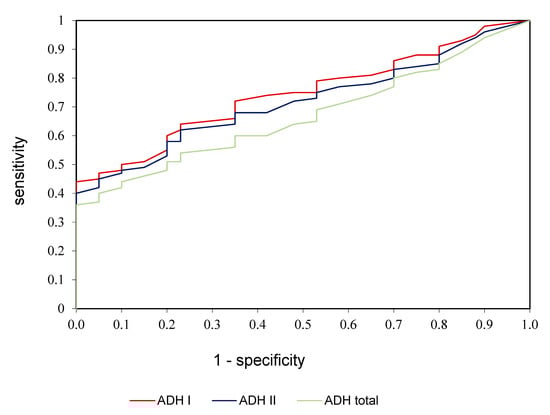 ROC analysis of ADH I, ADH II, and ADH total in patients with alcoholic fatty liver compared to control group.