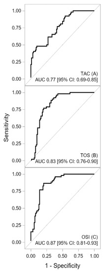 Receiver operating characteristic curves for TAC (A), TOS (B), and OSI (C) concentrations. Description: The area under the receiver operating characteristic curve indicated a good discriminatory power of TAC and TOS levels for HCM detection. The combined assessment of the oxidative-antioxidative balance by OSI showed excellent discriminatory power for HCM detection. Abbreviations: AUC—area under curve; CI—confidence interval; OSI—oxidative stress index; TAC—total antioxidant capacity, TOS—total oxidant status.