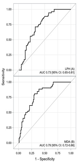 The receiver operating characteristic curve for LPH (A) and MDA (B) concentrations. Description: The area under the receiver operating characteristic curves indicated acceptable predictive power of LPH and MDA serum concentrations for HCM detection. Abbreviations: AUC—area under curve; CI—confidence interval, LPH—lipid hydroperoxide; MDA—malondialdehyde.